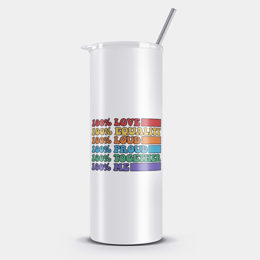 100% Me Stainless Steel Pride Tumbler, a 600ml (20 oz) travel companion with a metal straw that’s always ready for your adventures. It boasts double-walled insulation technology to keep your drinks at the perfect temperature for longer.