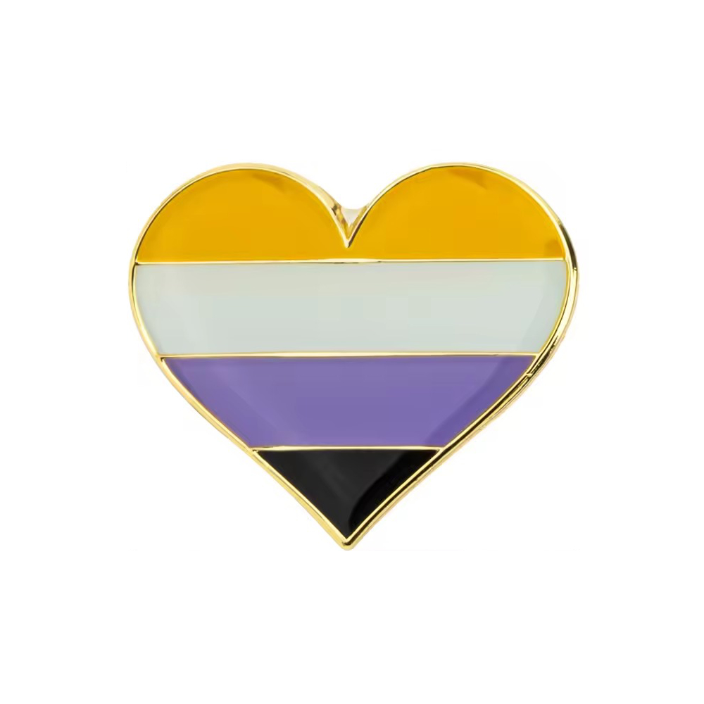 Showcase your identity with this striking Non-Binary pride heart pin. Featuring the bold yellow, white, purple, and black stripes, this accessory celebrates gender diversity beyond the binary. Crafted from hypoallergenic, gold-toned zinc alloy, it offers a high-shine, skin-safe finish that’s perfect for adding meaningful flair to any outfit.