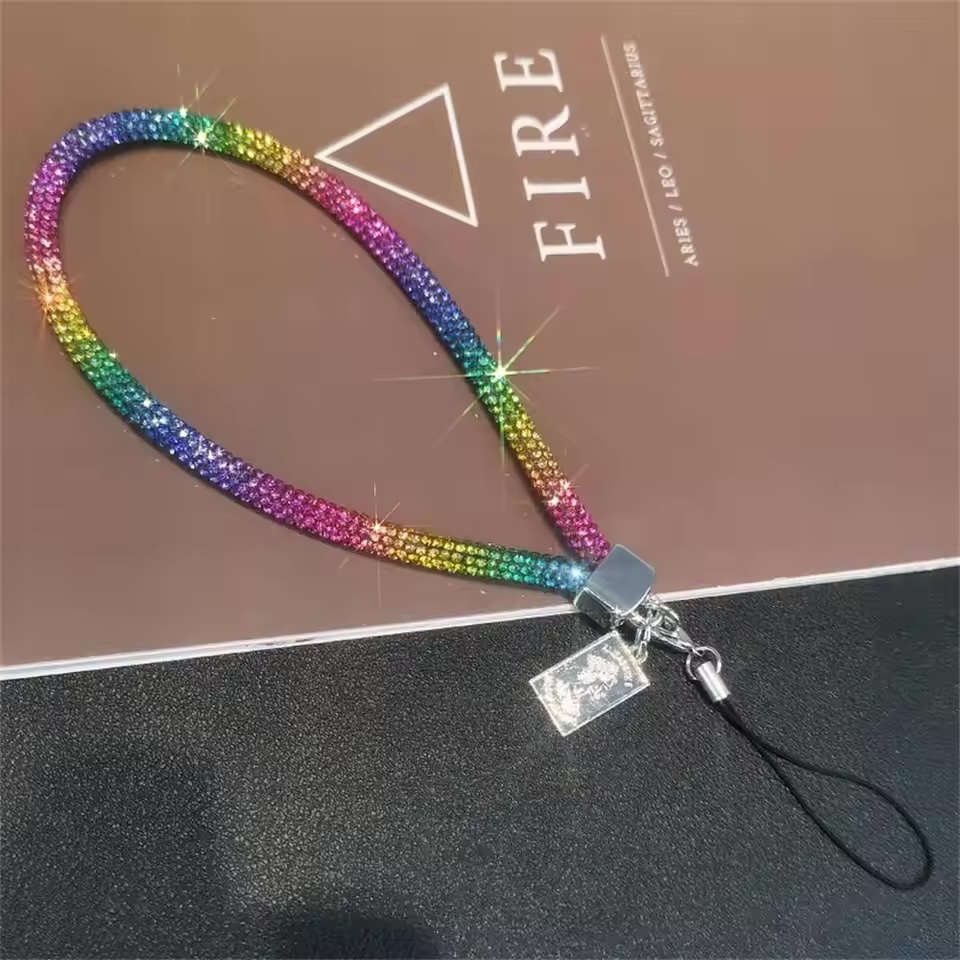 Add a splash of vibrant sparkle to your accessories with this 19cm Dazzling Rainbow Hand Lanyard. Covered in shimmering, multi-colored rhinestones, this wrist strap is perfect for keeping your phone, keys, camera, or ID badge secure and close at hand. It features a sturdy metal cube connector and a small charm, ensuring both durability and eye-catching style.