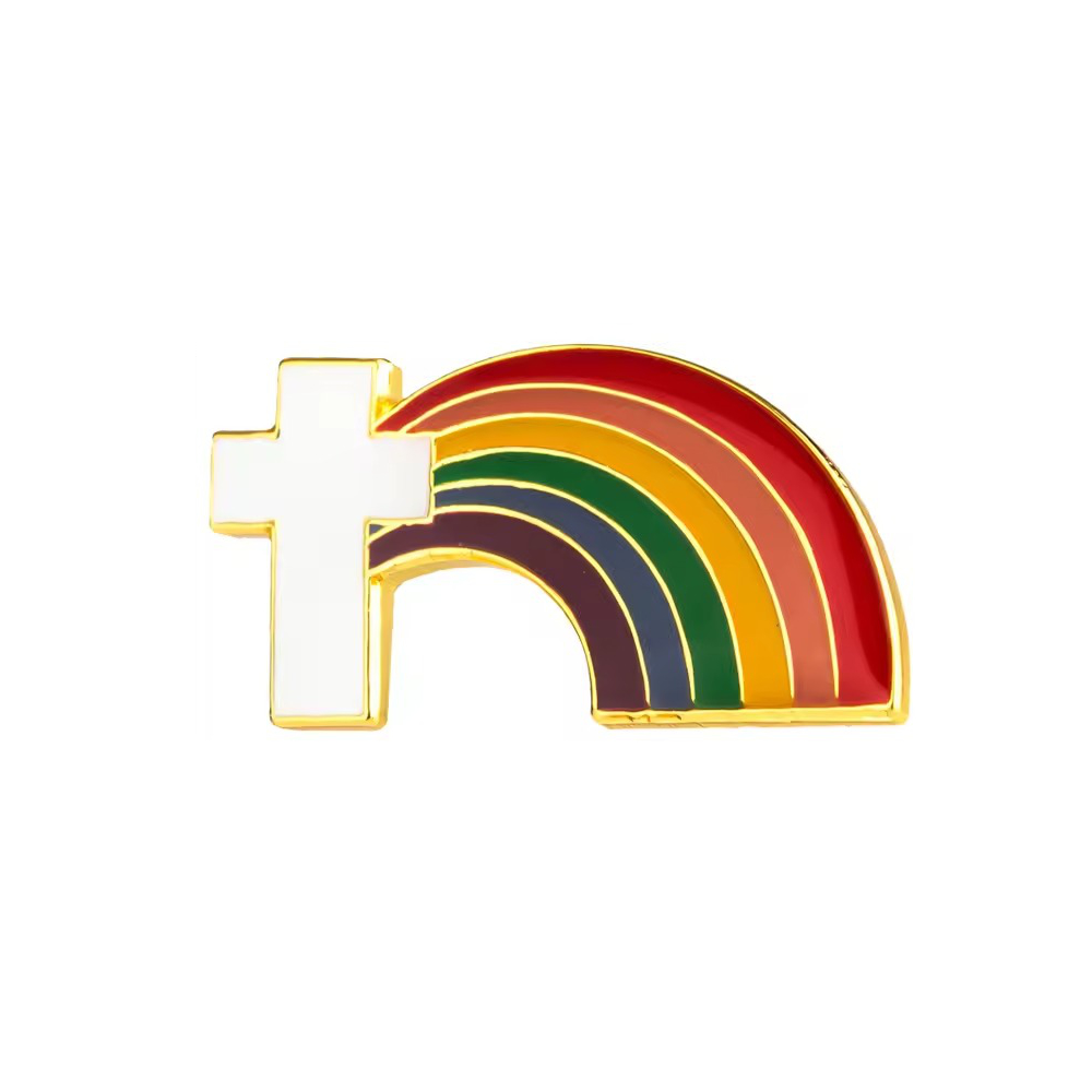Celebrate faith and inclusivity with this vibrant Rainbow Cross Enamel Pin. Featuring a bold rainbow arc and a clean white cross, this pin is a beautiful symbol of LGBTQ+ Christian pride. Crafted from gold-toned zinc alloy, its sleek design is perfect for lapels, bags, or lanyards.