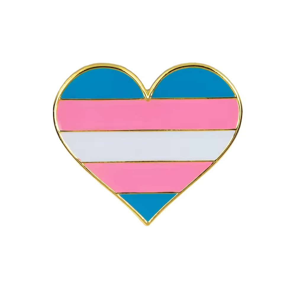 Celebrate your journey with this Transgender Pride heart pin, featuring the iconic light blue, pink, and white stripes. This sleek accessory is a meaningful way to represent trans visibility and pride wherever you go. Crafted from high-polished, gold-toned zinc alloy, it provides a bright, durable finish that stands out on any accessory.